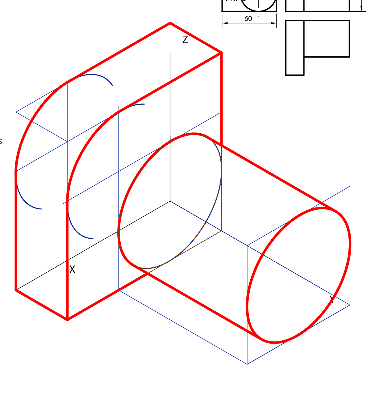 2º Vamos contruyendo la figura. En las partes cilíndricas hay que tener en cuenta los segmentos tangentes que nos marcan el contorno. También ten presente las partes vistas y ocultas.